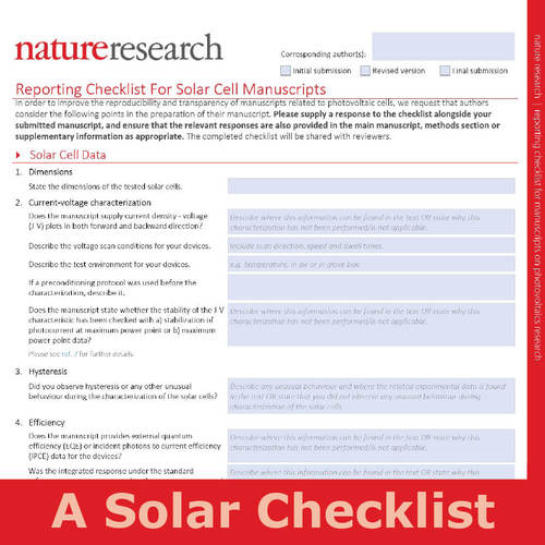 Nature Publishing Group highly recommends authors of papers related to solar-cell research complete this solar checklist of submitted information to aid the reproducibility and transparency of results.
